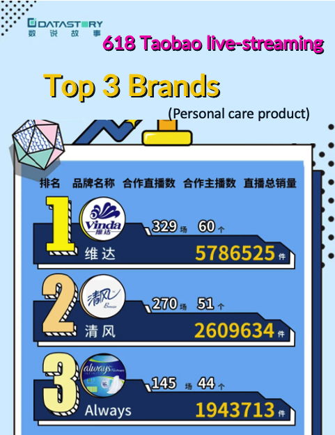 According to the report from Data Story, it shows that: The personal care product is a relatively high category in Taobao live streaming except Beauty product, the tissues are the most popular products because consumers are attracted by discounts; amongst KOL, it is still headed by Weiya Viya and Li Jiaqi, with 975,195 and 678,204 products sold respectively.